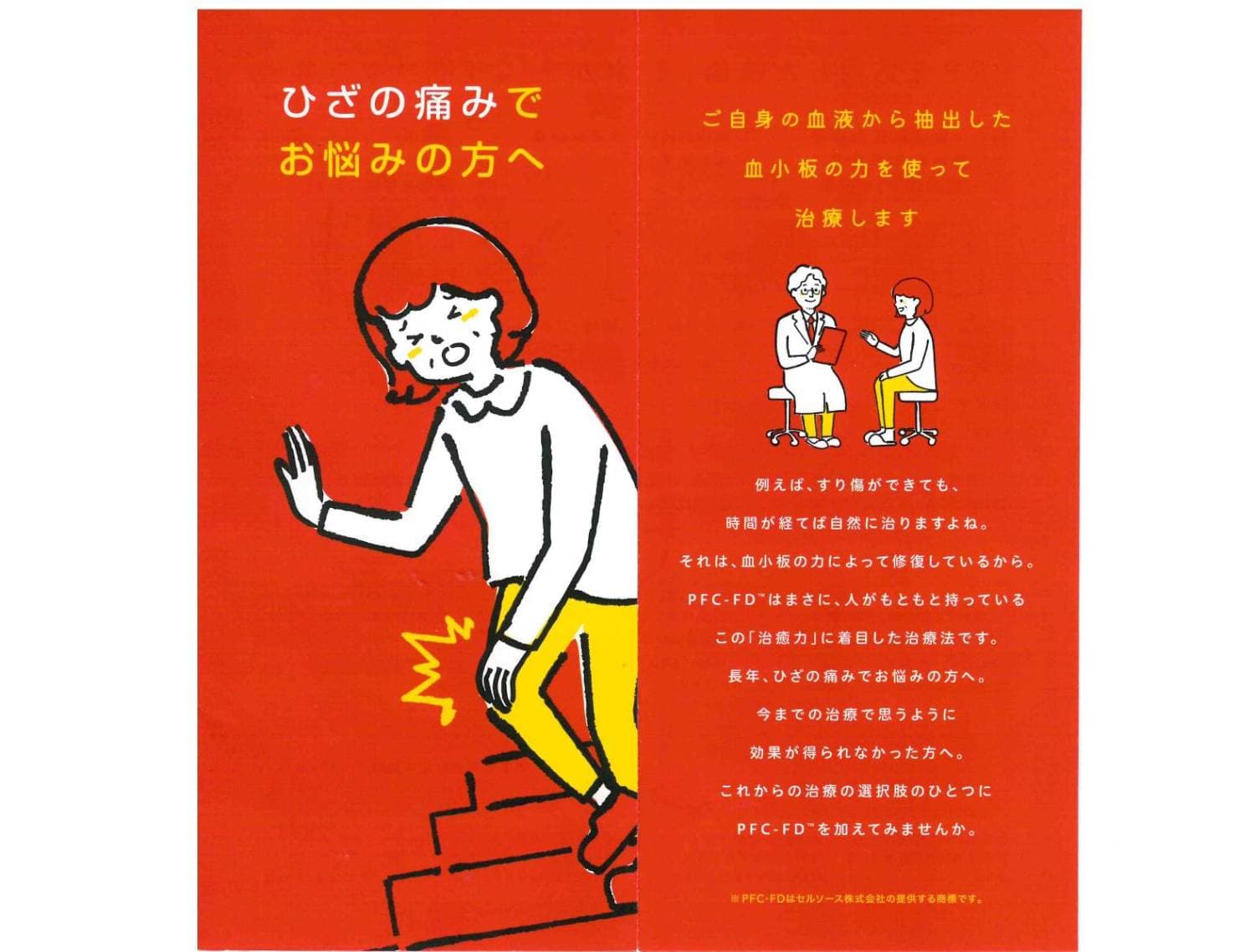 膝・肩関節の痛みにお悩みの方に向けた、切らない関節治療に関する相談外来です。 ※ご予約は当院に初めて受診される方に限ります。 関節痛の治療歴が長い方、他院で治療を受けているがなかなか効果が得られない方、手術や保存療法(ヒアルロン酸注射/服薬)以外の治療法を探している方は、一度ご相談ください。 【治療内容】 これまでの「保存療法」や「手術療法」の間に位置する、PFC-FDと呼ばれる新しい治療法です。 患者さま自身の血液を使い、痛みの緩和や損傷部位の機能改善を目指す治療法で炎症を抑える作用が特徴です。 注射後の痛みや腫れも比較的少ないため、関節に優しい治療となります。 【費用】 施術代:198,000円(税込) ※治療の同意書にサインされた場合にお支払いいただく費用となります。 ※採血後の検査結果により治療ができないと判断された場合は、検査費用:13,200円(税込)のみご請求いたします。 ※治療内容をご説明の上、治療を受けられない場合は診察料(保険適用)のみご請求いたします。 【主な治療の流れ】 (1)問診・診断 関節の痛みや違和感の程度、これまで行ってきた治療についてお伺いします。 (2)採血 約50mlの血液を採取し、専門機関に検査を依頼します。 (3)検査・加工・凍結乾燥 検査後に特殊な技術を用いて、加工・凍結乾燥を行います。(所要期間:3週間程度) (4)患部へ注射 採血からおよそ3週間後に再度ご来院いただき、関節に注射して治療は完了です。