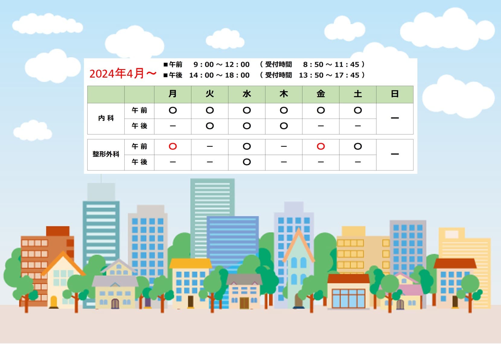 ※整形外科の診療は月曜、水曜、木曜、金曜、土曜(午前)。